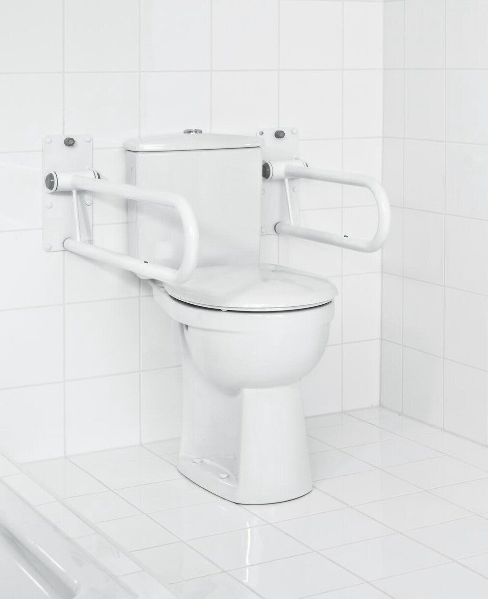 Met de opklapbare beugel kan er veilig en zelfstandig gebruik worden gemaakt van het toilet. Zitten en opstaan wordt zo een stuk gemakkelijker gemaakt. Installeer de beugel in de buurt van het toilet of de wastafel. De beugel is uitgerust met een valbeveiligingsmechanisme die ervoor zorgt dat de stang langzaam naar beneden schuift. Het draagvermogen is maximaal 80 kg. Wanneer deze niet in gebruik is kan de beugel verticaal opgeklapt worden.