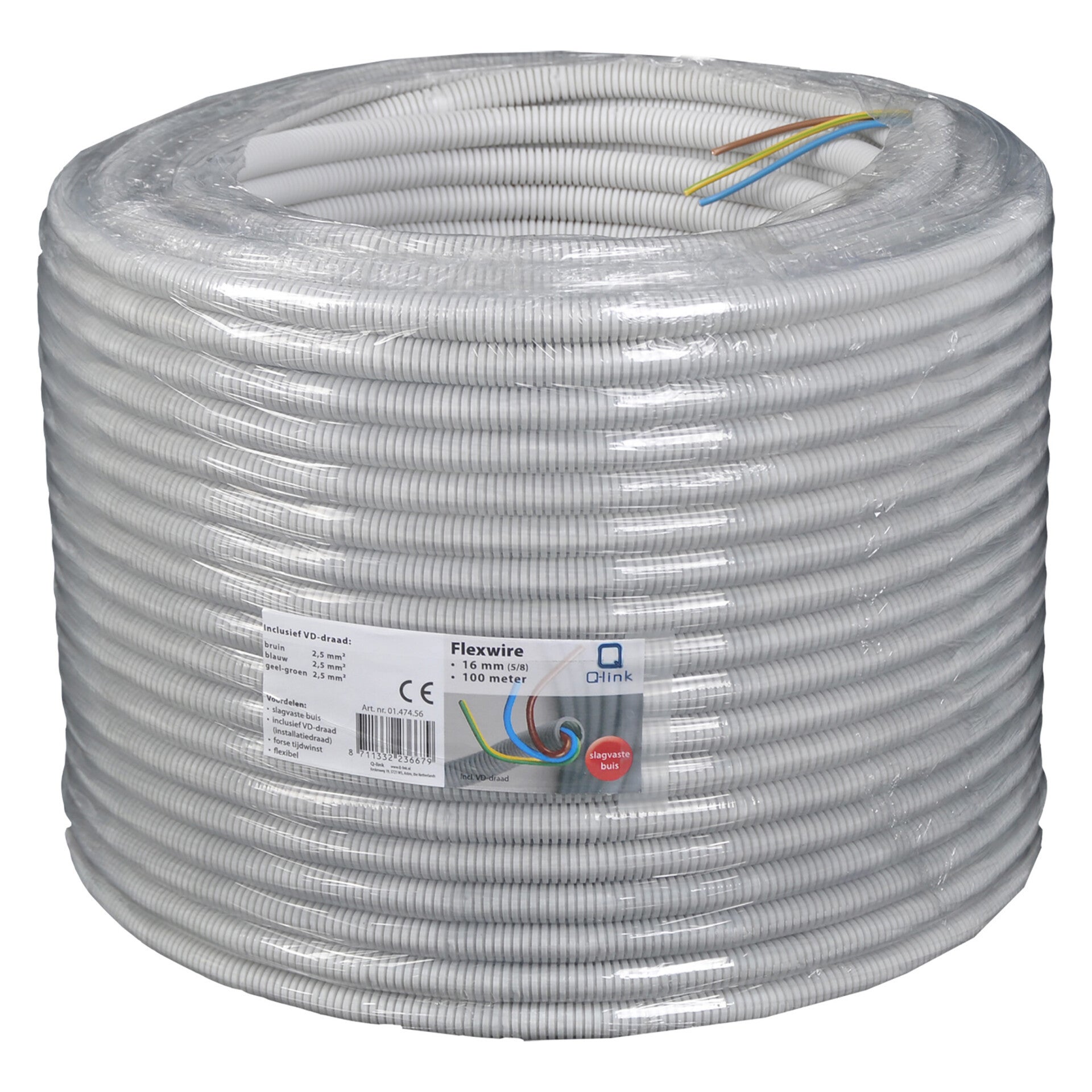 Slagvaste buis. Iinclusief VD-draad. (installatiedraad). Forse tijdwinst. 10 cm markering op buis. Inclusief VD-draad:bruin 2,5 mm, blauw 2,5 mm, geel-groen 2,5 mm. Kemakeur. Halogeen vrij. Vlamdovend.
