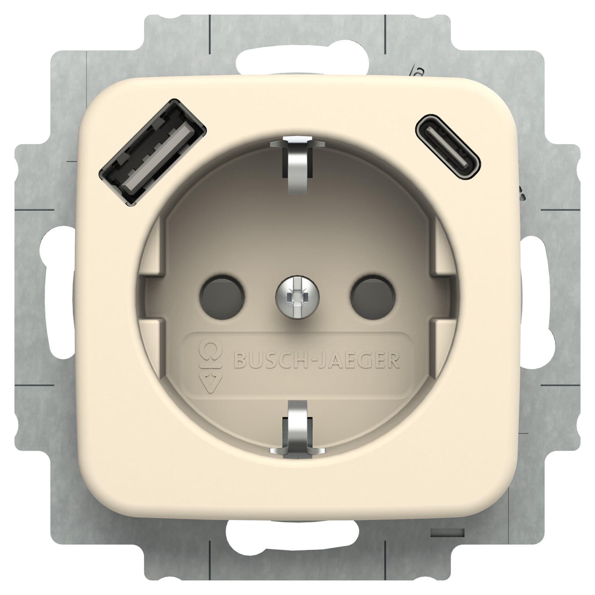Inbouw wandcontactdoos. Met randaarde. Met verhoogde aanraakbeveiliging. Met 1x USB-A en 1x USB-C voeding.