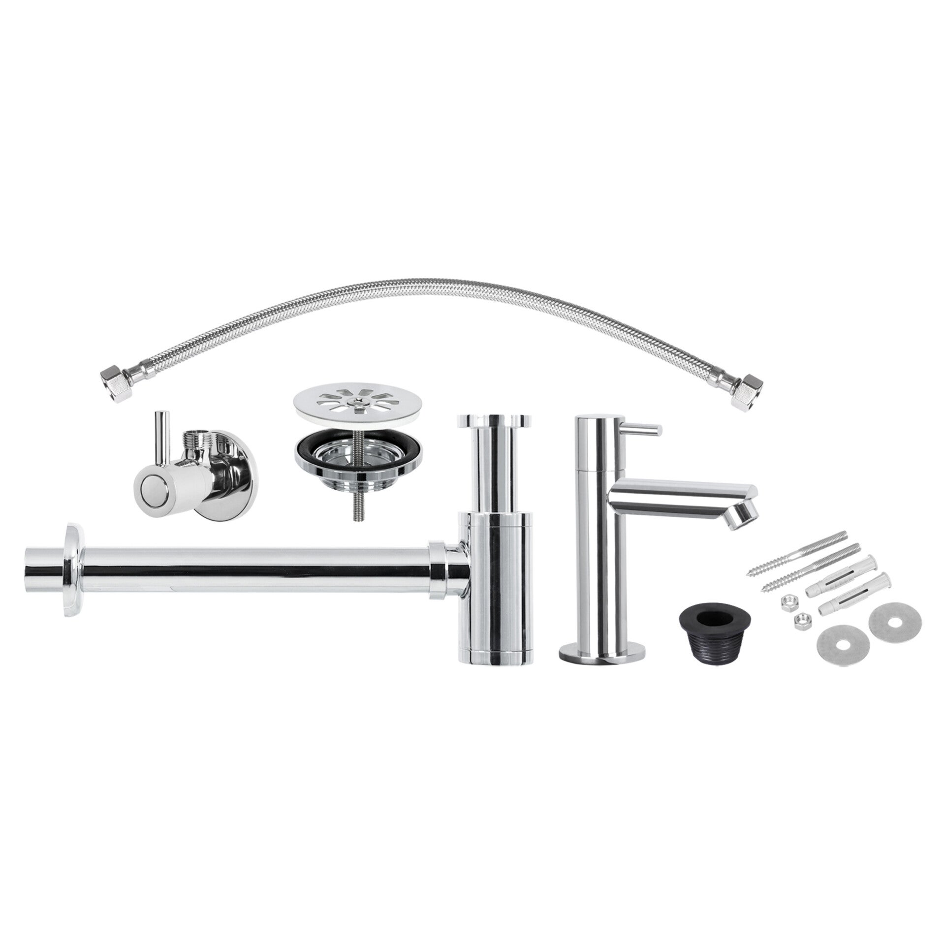 Met deze set installeer je een fontein bakje op je toilet of badkamer. Het is een complete set die alles bevat behalve het bakje zelf. De set is uitgevoerd in messing. Deze installatie set in de kleur mat chroom bestaat uit: hoekstopkraan 1/2 x 3/8 mat chroom, koudwaterkraan recht mat chroom, sifon manchet 32/40 zwart, sifon mat chroom, afvoerplug mat chroom, aansluitslang flexibel, bevestigingsset tbv fontein.