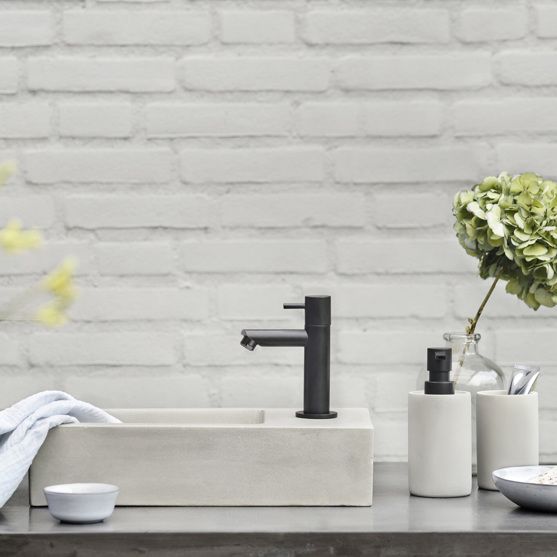 De fraaie design koudwaterkranen van Differnz komen in allerlei kleuren en variaties. De kranen zijn vervaardigd van messing en hebben keramische schijven. De waterhoeveelheid is met een eenvoudige hendel te bedienen. Deze variant heeft een recht aflopende kraan en is afgewerkt met een mat zwarte finish. De water aansluitslang wordt niet meegeleverd.