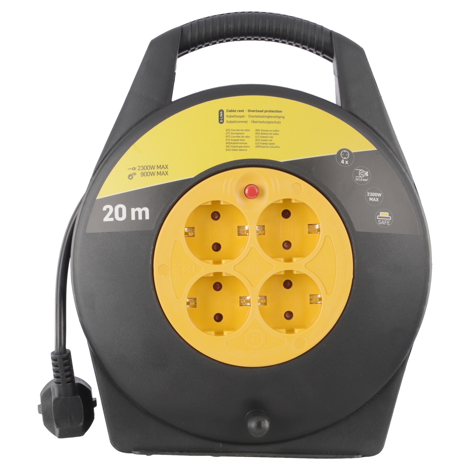 Kabelbox in de kleur zwart/geel met 4 randaarde stopcontacten. Met randaarde en overbelastingbeveiliging. Vinylkabellengte van 20 m en doorsnede van 3 x 1 mm². Maximaal vermogen van 2200W en in opgerolde toestand 1100W.