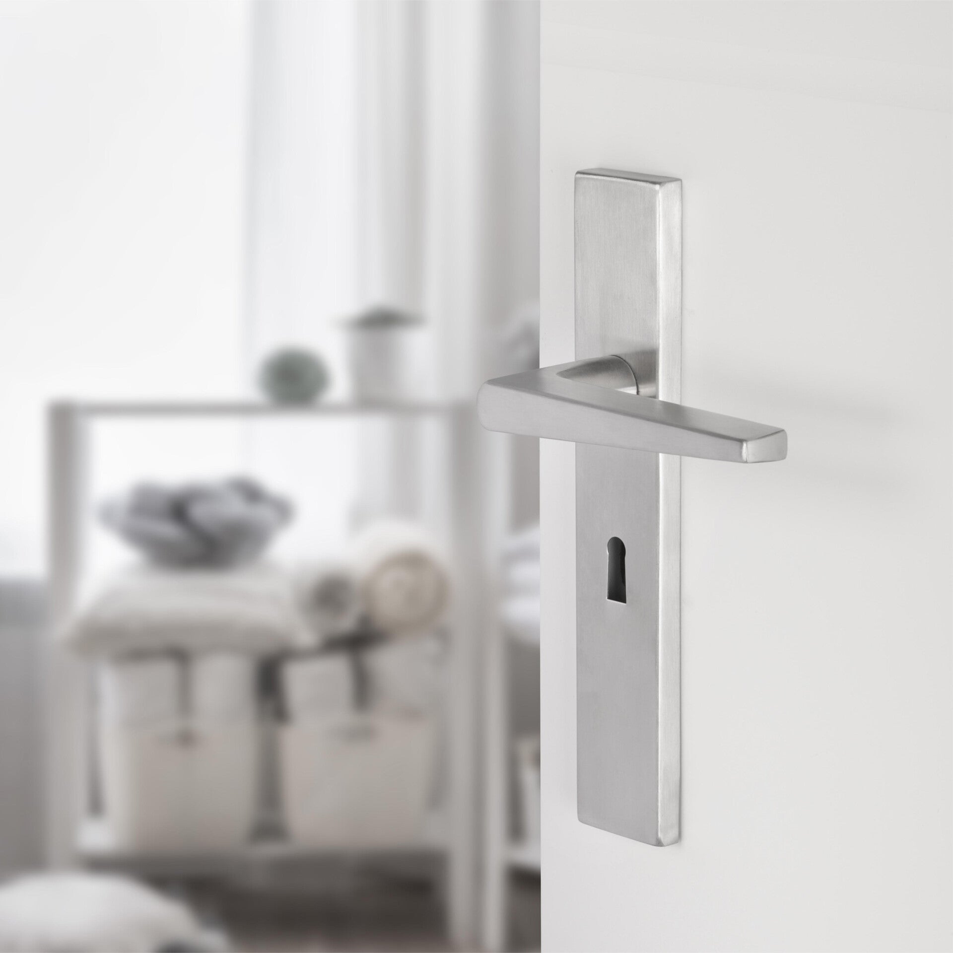 Deurkruk op vierkant schild uit de Differnz Rotterdam-serie, met sleutelgat. Greep bevat driehoekige uitloop. In de kleur mat chroom. Per 2 verpakt in een complete set. Gemaakt van roestvrij staal, dus duurzaam, roestbestendig en eenvoudig in onderhoud. Bovendien gemakkelijk te monteren!