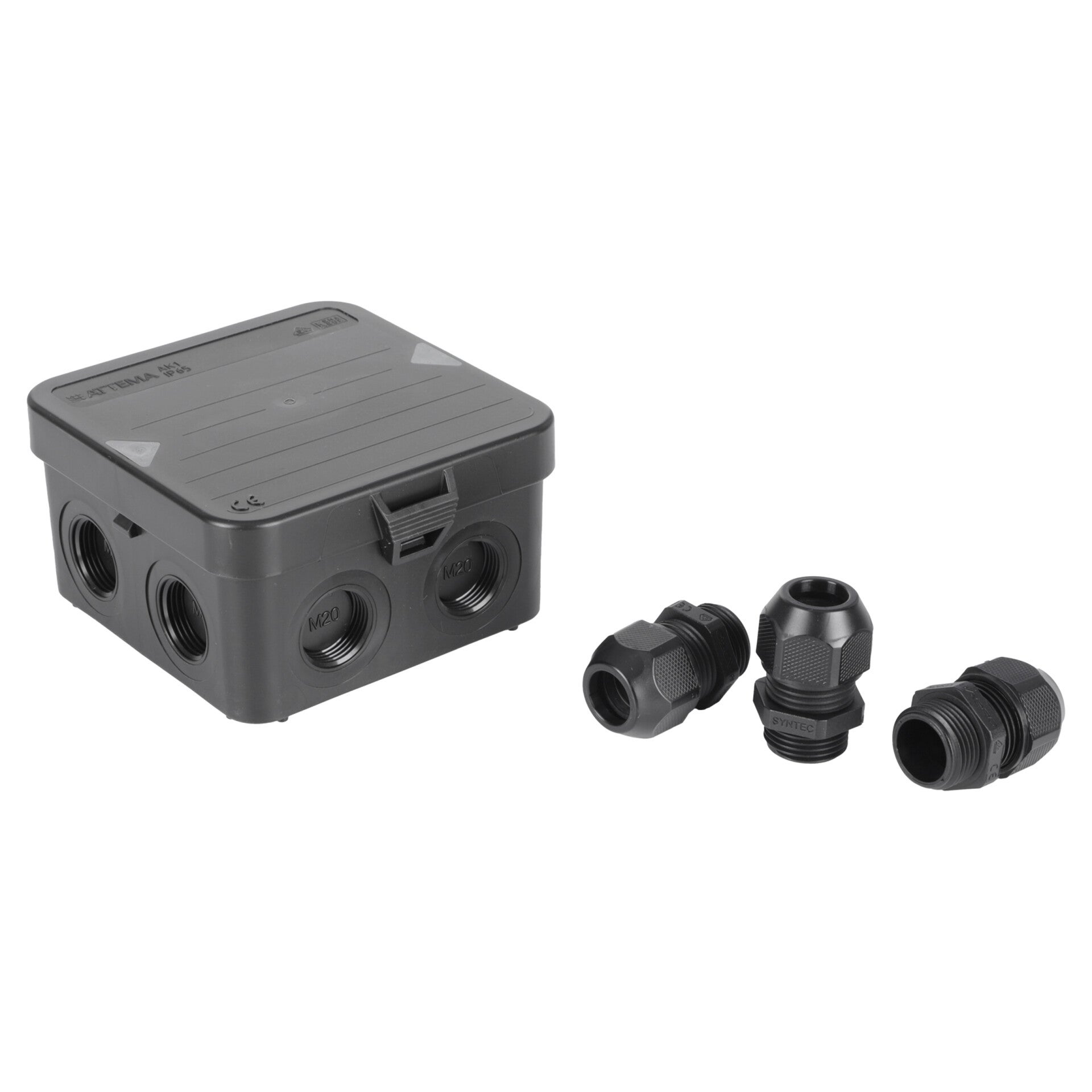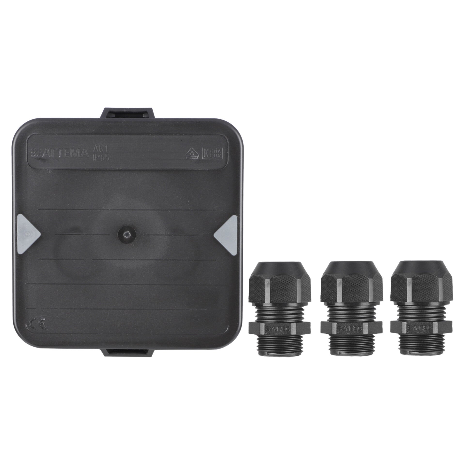 Kabeldoos met 3 wartels, KEMA-gecertificeerd, beschermingsklasse IP65 (stofdicht en beschermd tegen waterstralen). Geschikt voor veilige en betrouwbare verbindingen van elektrische kabels in vochtige en stoffige omgevingen. Kleur: zwart.