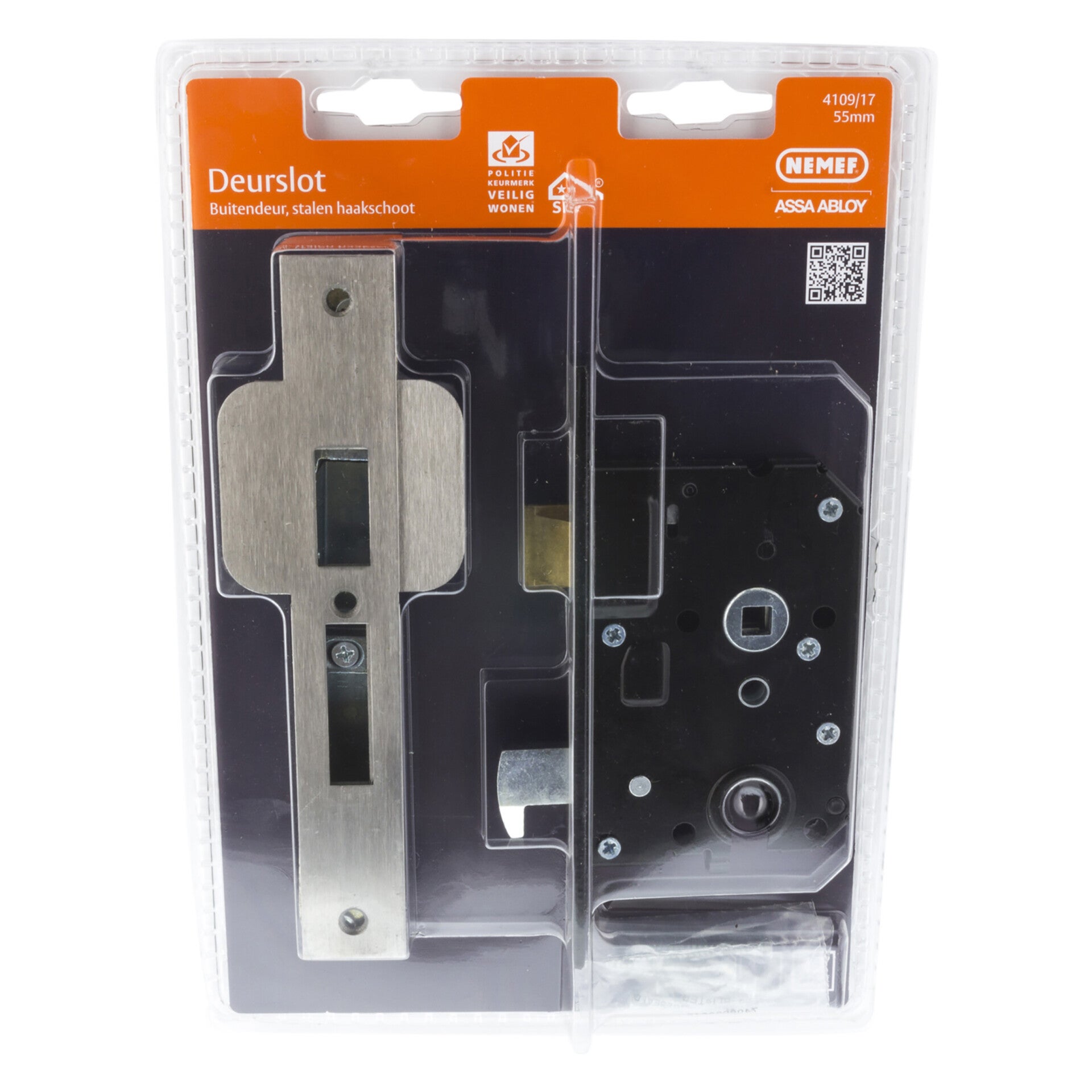 Type 4109/17. Rechthoekig. Doornmaat 50 mm. Afstand 55 mm. Ter vervanging van de 1200- en 4119 serie. Veiligheidsslot klasse zwaar inbraakwerend SKG**. Extra inbraakwerendheid door haakschoot. Geschikt voor toepassing volgens NEN 5096 inbraakwerendheidsklasse 2 i.c.m. 2 veiligheidsbijzetsloten. Uitermate geschikt en soms verplicht voor toepassing in smalle kozijnen of glaspartijen naast de deur. Voor links- en rechtsdraaiende deuren. Uniforme slotkastafmeting met 1200 serie en 4119. Eenvoudig omlegbare dagschoot. Messing dagschoot. Gehard stalen verzinkte haakschoot. RVS rechthoekige voorplaat. Gelakte slotkast. 1-toers. Sluitplaat P 4109/17 standaard bijgeleverd.