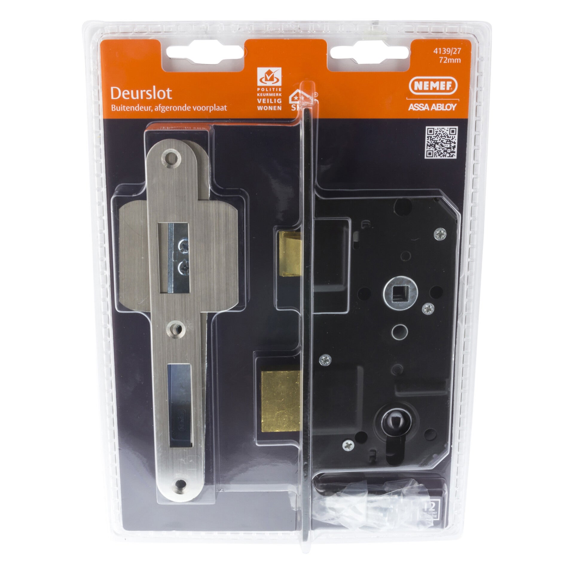 Type 4139/27. Afgerond. Rechts en links bruikbaar. Dagschoot messing en omlegbaar. Nachtschoot messing met beveiligingspennen. ééntoers uitslag. Kast: staal gelakt. Voorplaat: RVS. Voorplaat: 174 x 25 mm. Slotkast: 81,3 x 122 mm. Doornmaat 50 mm. Afstand72 mm. Sluitkom VS 4000 of VS 4004 verstelbaar. Inclusief sluitplaat P4119/27 afgerond.