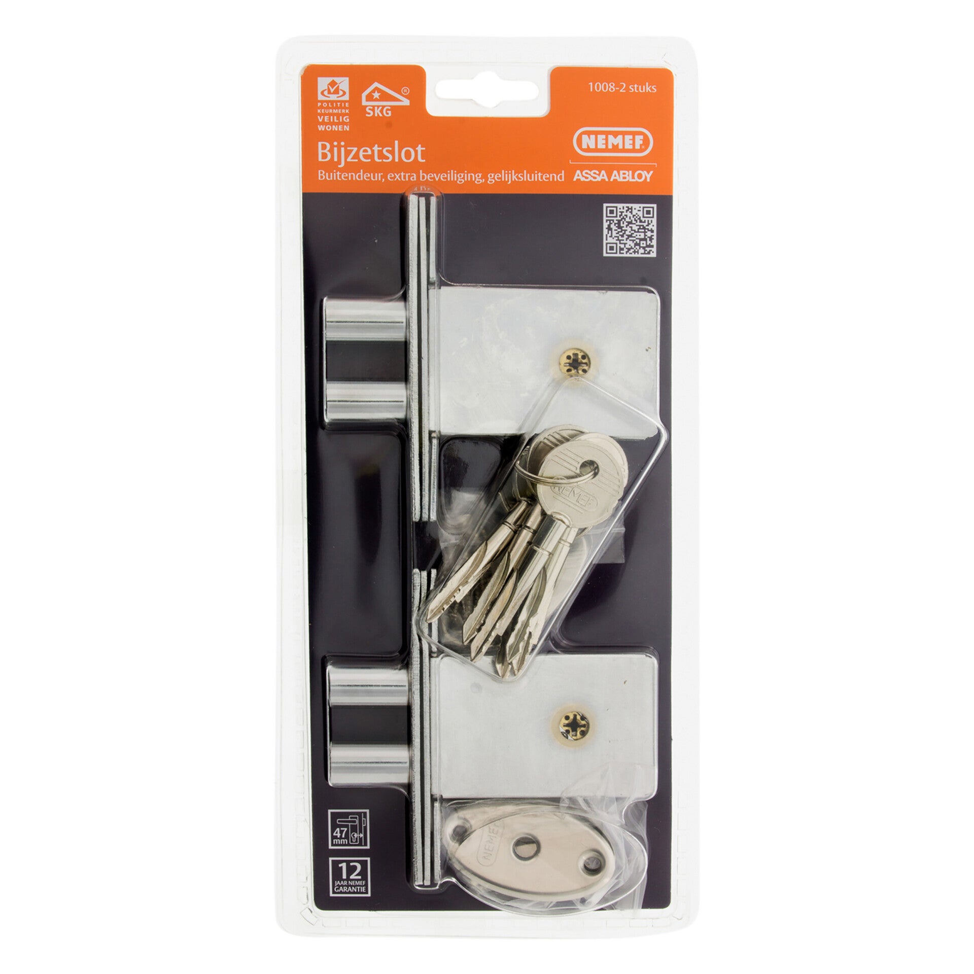 Type 1008. Inclusief 3 sleutels. Inclusief 2 sleutelrozetten. Staal vernikkeld. ééntoers uitslag. Materiaal nachtschoot: staal geslepen. Doornmaat 47 mm.