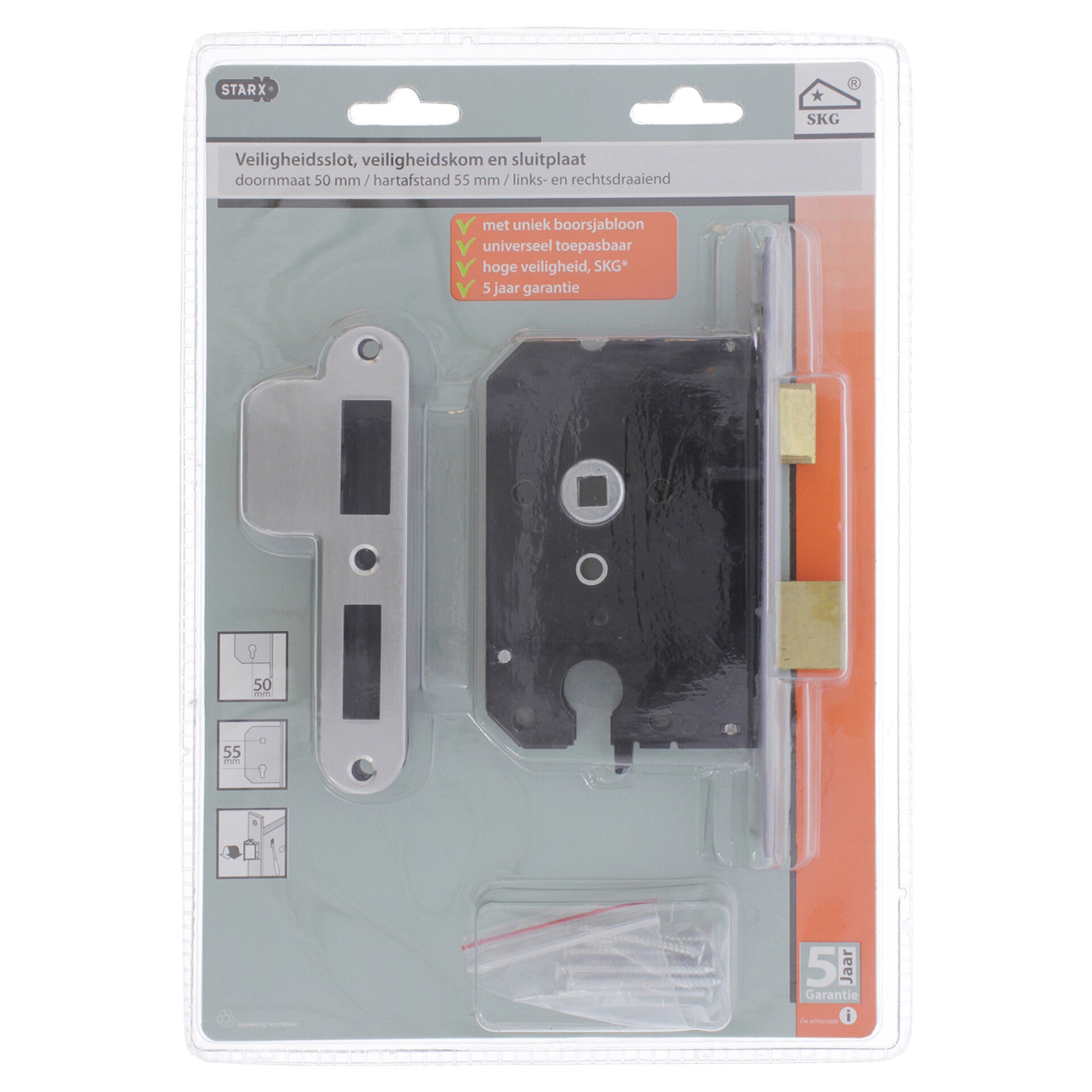Afgerond. Rechts en links bruikbaar. Dagschoot messing en omlegbaar. Nachtschoot messing met beveiligingspennen. ééntoers uitslag. Kast: staal gelakt. Voorplaat: RVS. Voorplaat: 174 x 20 mm. Slotkast: 78 x 115 mm. Doornmaat 50 mm. Afstand 55 mm. Universele rechts en links bruikbare sluitkom gietijzer gelakt. Deze sluitkom kan niet zonder sluitplaat worden toegepast. Met keurmerk SKG / PKVW.