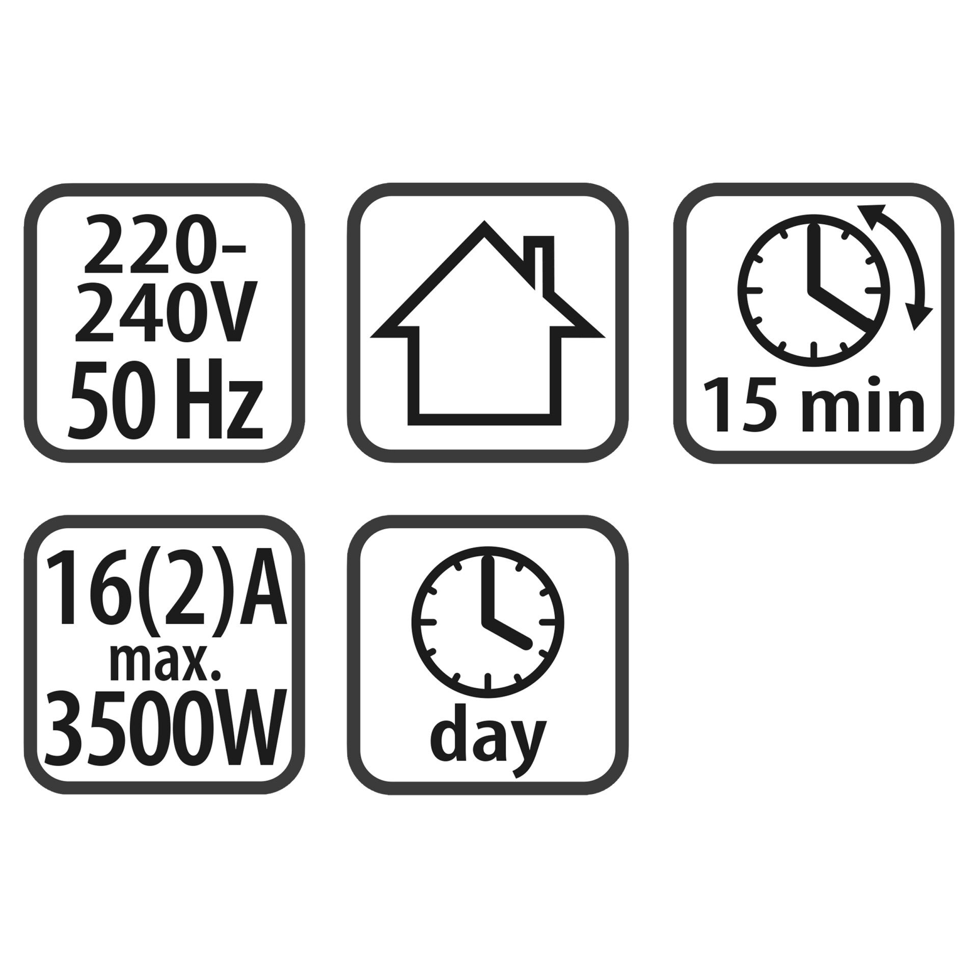 Mechanische tijdklok met dagprogramma, vaste ruiters. Per dag 96 schakelmomenten mogelijk. Kleinste schakeltijd 15 minuten. Max. 3500W / 16(2)A. Nominale spanning: 220-240 V~ 50 Hz.