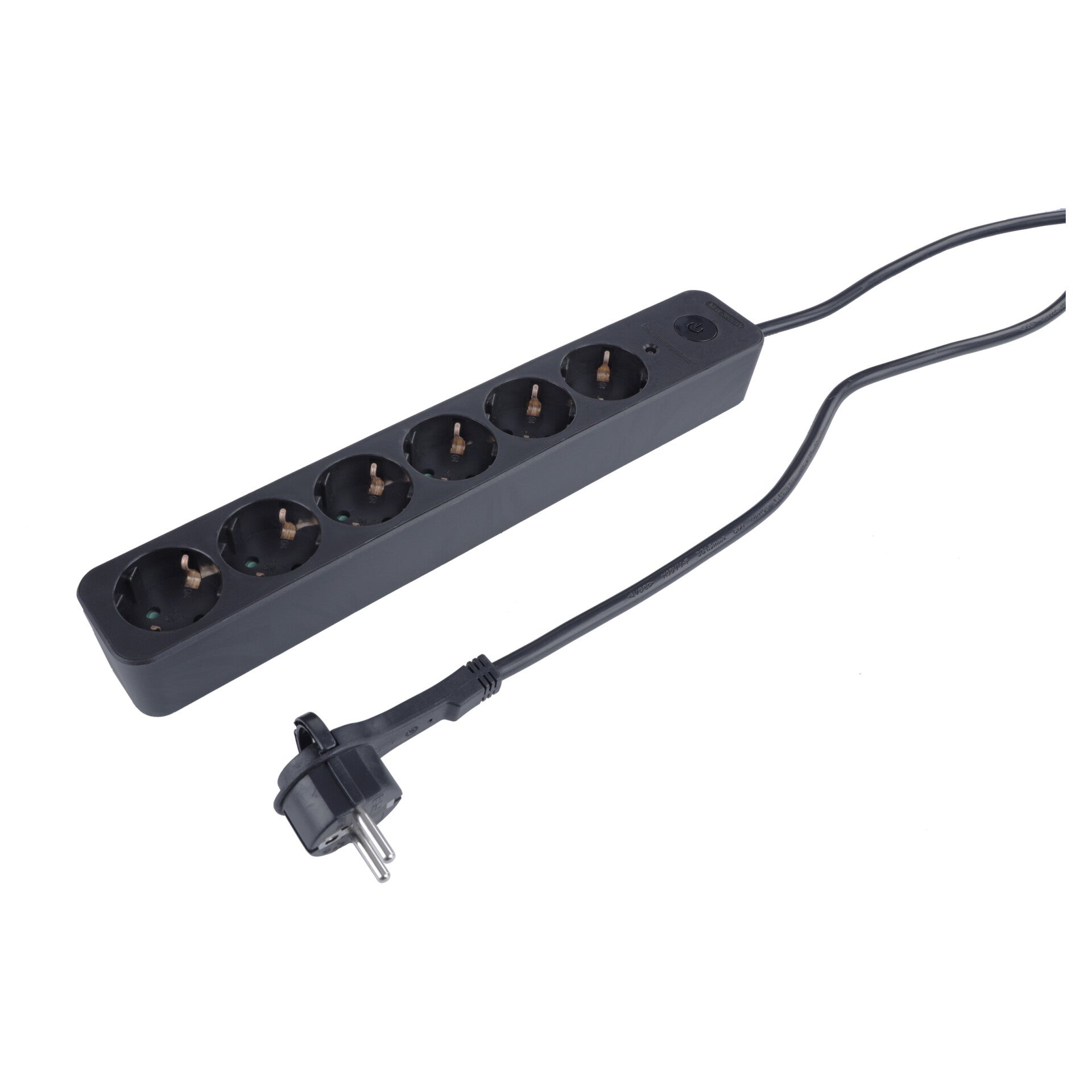 6-voudige stekkerdoos. Met schakelaar. Met ingebouwde overspanningsbeveiliging tegen stroompieken. Met een platte stekker van 8 mm. PVC kabel 1.5 meter, 3 x 1,5 mm². Maximaal vermogen: 3680 watt.