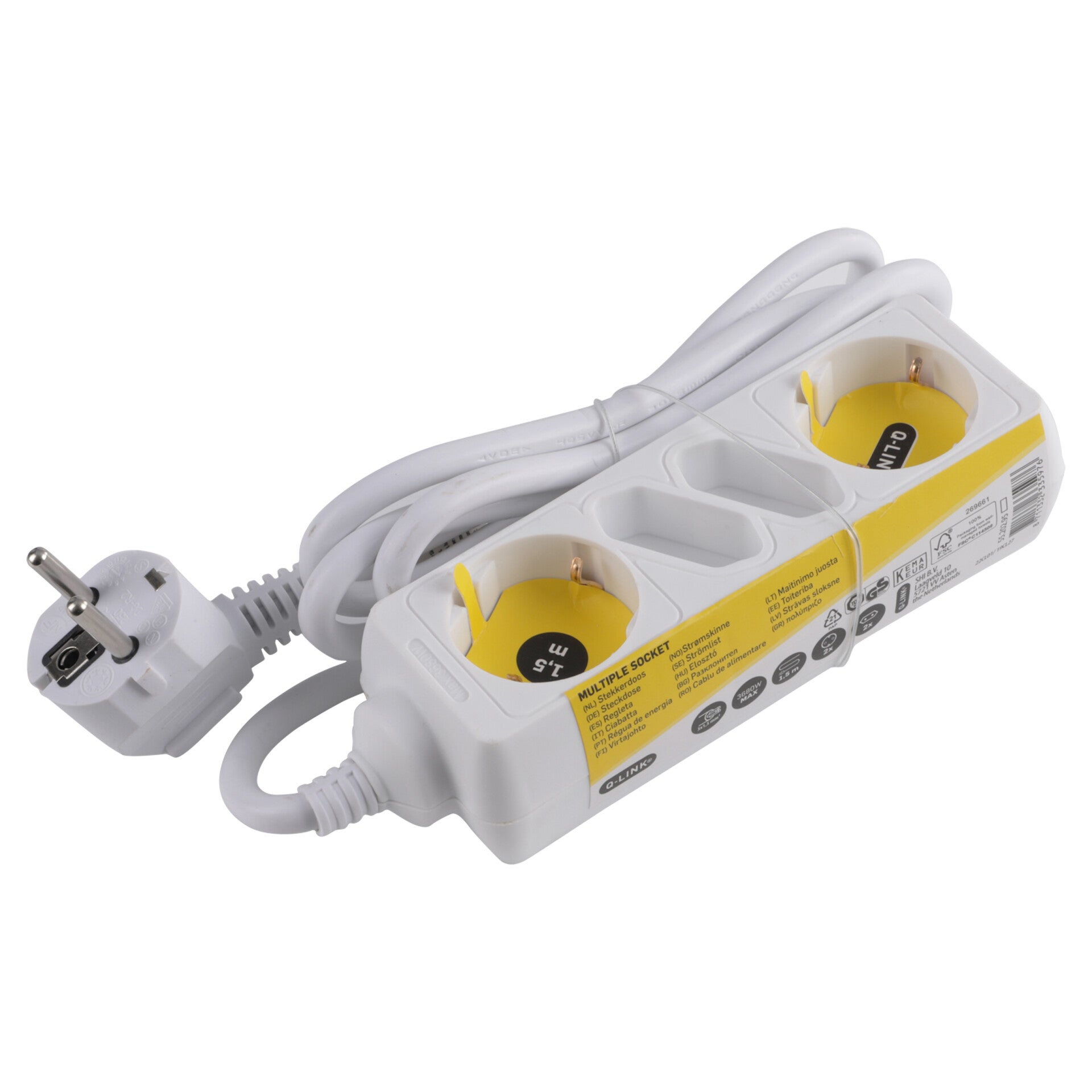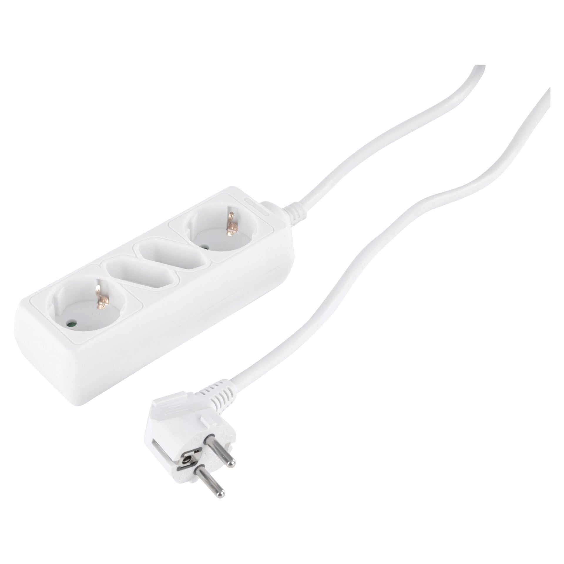Witte stekkerdoos 4-voudig. Met 2 x randaarde stopcontact. Met 2 x Euro stopcontact. Maximaal 3680 Watt. Vinyl kabel 1.5 meter, 3 x 1.5 mm².