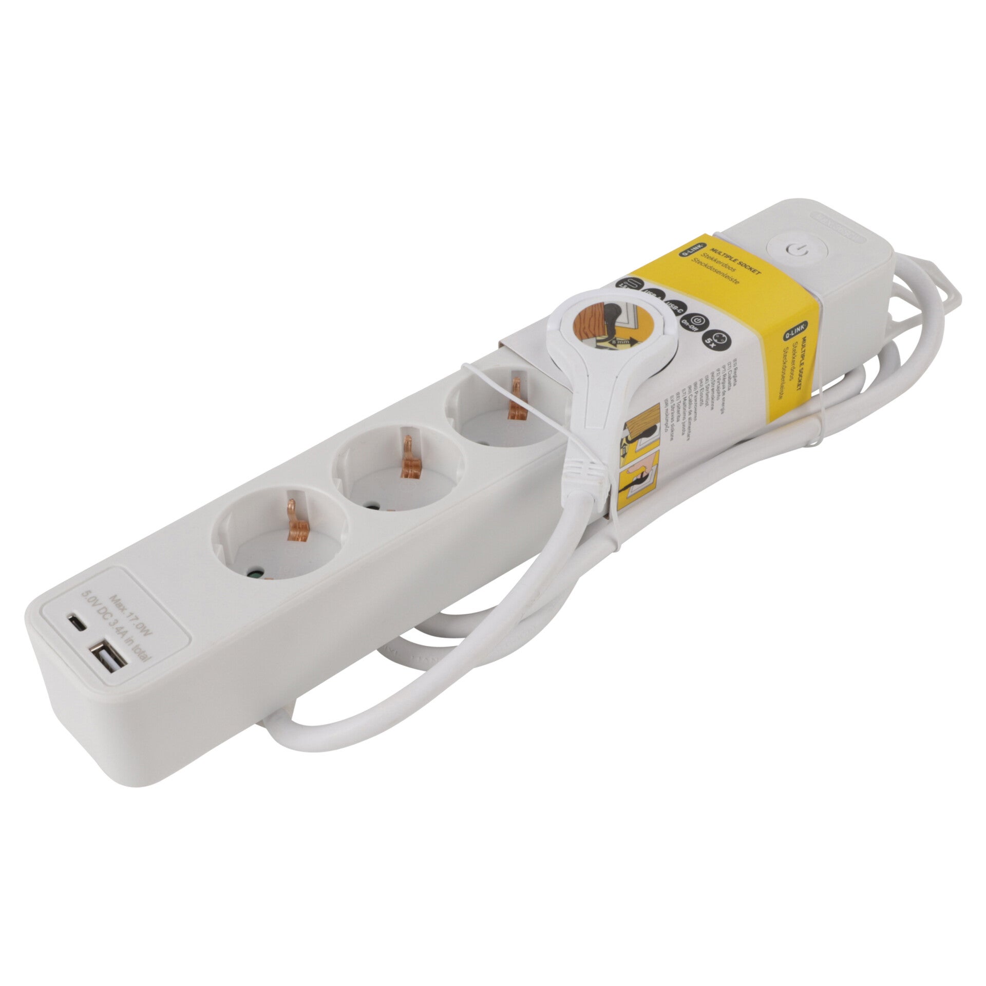 Maak kennis met de Q-Link 5-voudige stekkerdoos, de perfecte keuze voor jouw elektronische apparaten. Deze stekkerdoos is ontworpen met het oog op gemak en efficiëntie, waardoor jouw elektronica veilig en geoptimaliseerd wordt aangesloten. De Q-Link stekkerdoos is niet zomaar een stekkerdoos. Met 2 ingebouwde USB-poorten breid je jouw oplaadmogelijkheden uit, zonder dat je een extra adapter nodig hebt. Sluit jouw elektronica aan en laad je apparaten op met vertrouwen en snelheid. Upgrade je stroomoplossingen met Q-Link. 5-voudige stekkerdoos met 2 ingebouwde USB-poorten (1x USB A en 1x USB C). Beoordeelde output van 17,0W MAX / 3,4A - 5.0V DC voor snelle en efficiënte oplaadtijden. Extreem laag energieverbruik in stand-by-modus, slechts 0,062 W, wat bijdraagt aan een groenere levensstijl. Plat ontwerp voorkomt kabelwarboel en zorgt voor een georganiseerde en opgeruimde werk- of leefruimte. Uitgerust met een schakelaar voor het eenvoudig aan- en uitschakelen van aangesloten apparaten.