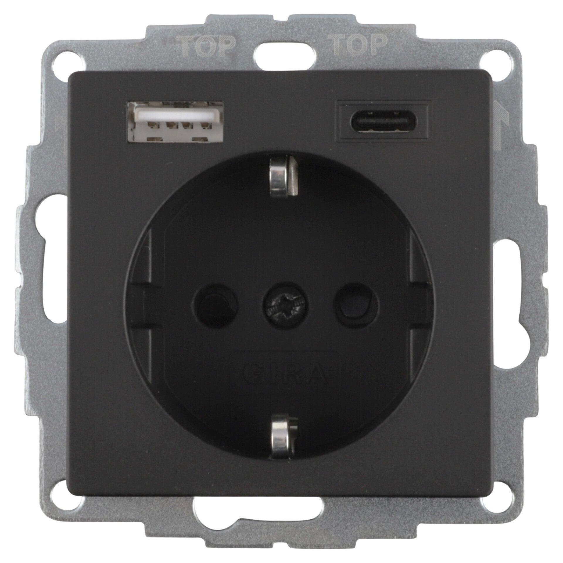 Gira SY55 inbouwcontactdoos met randaarde, verhoogde aanraakbeveiliging en geïntegreerde USB-A (2.4 A) en USB-C (3 A) poorten. Geschikt voor opladen van smartphones en voeden van USB-apparaten. Serie: Systeem 55.