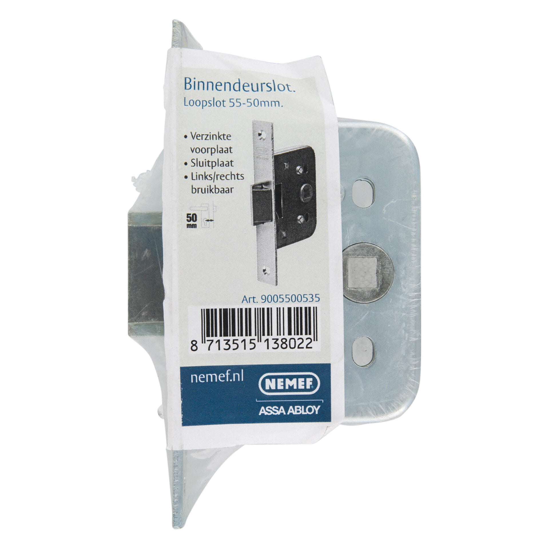 Type 55/50. Rechts en links te gebruiken. Kast en voorplaat: staal verzinkt. Sluitplaat: blank staal. Dagschoot: smeedbaar gietijzer. Voorplaat: 133x22 mm. Slotkast: 81x65/75 x 12 mm. Doornmaat: 50 mm.