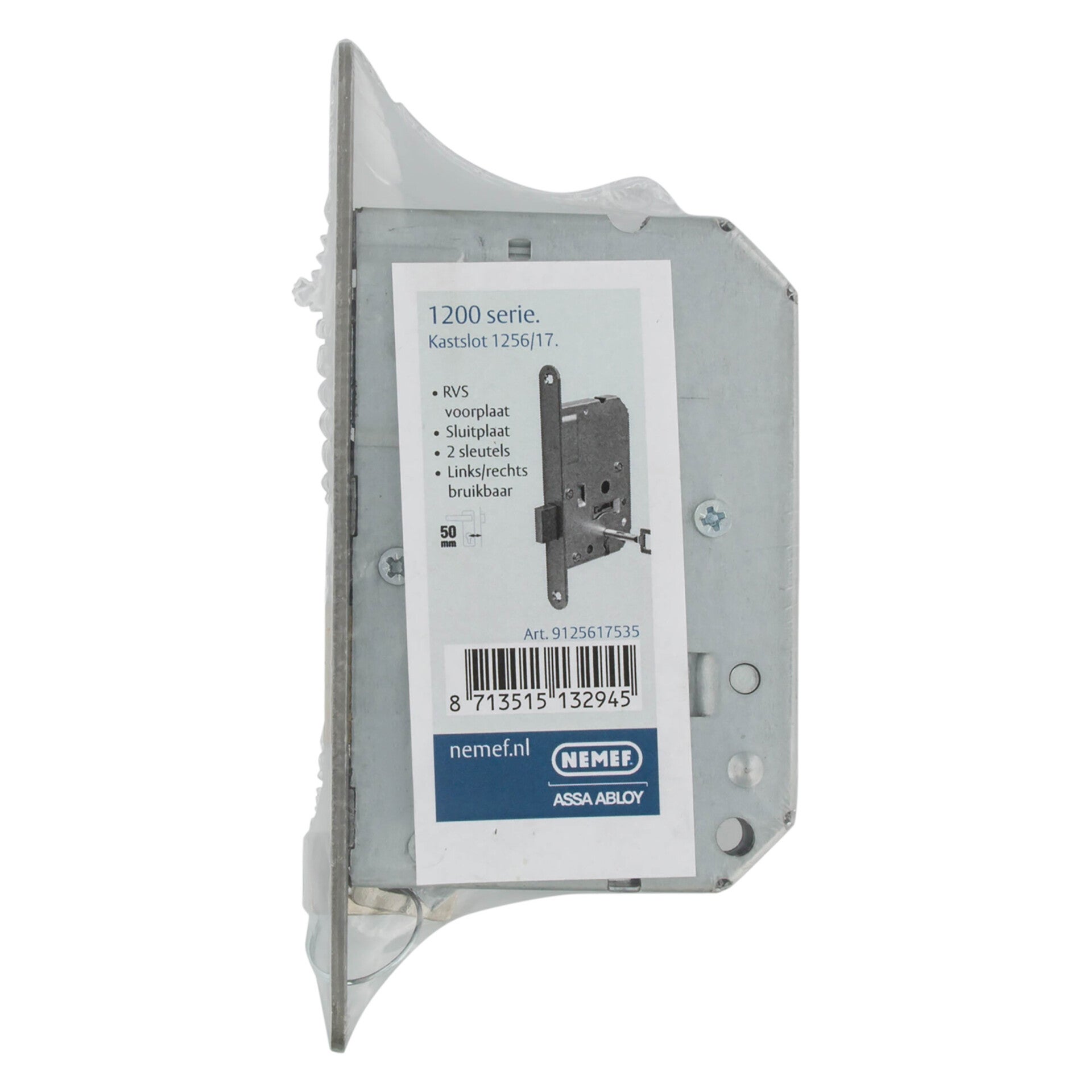 Type 1256. Rechts en links bruikbaar, 3 klavieren met 10 sluitingen (nrs 31-40). Afgeronde voorplaat, 2 dopsleutels (S1256). Kast: staal verzinkt. Sluitplaat: staal verzinkt. Nachtschoot: messing. Klavieren: messing. Sleutels: vernikkeld. Voorplaat: 174 x 20 x 2,75 mm. Slotkast: 117 x 81 x 13 mm. Doornmaat: 50 mm.