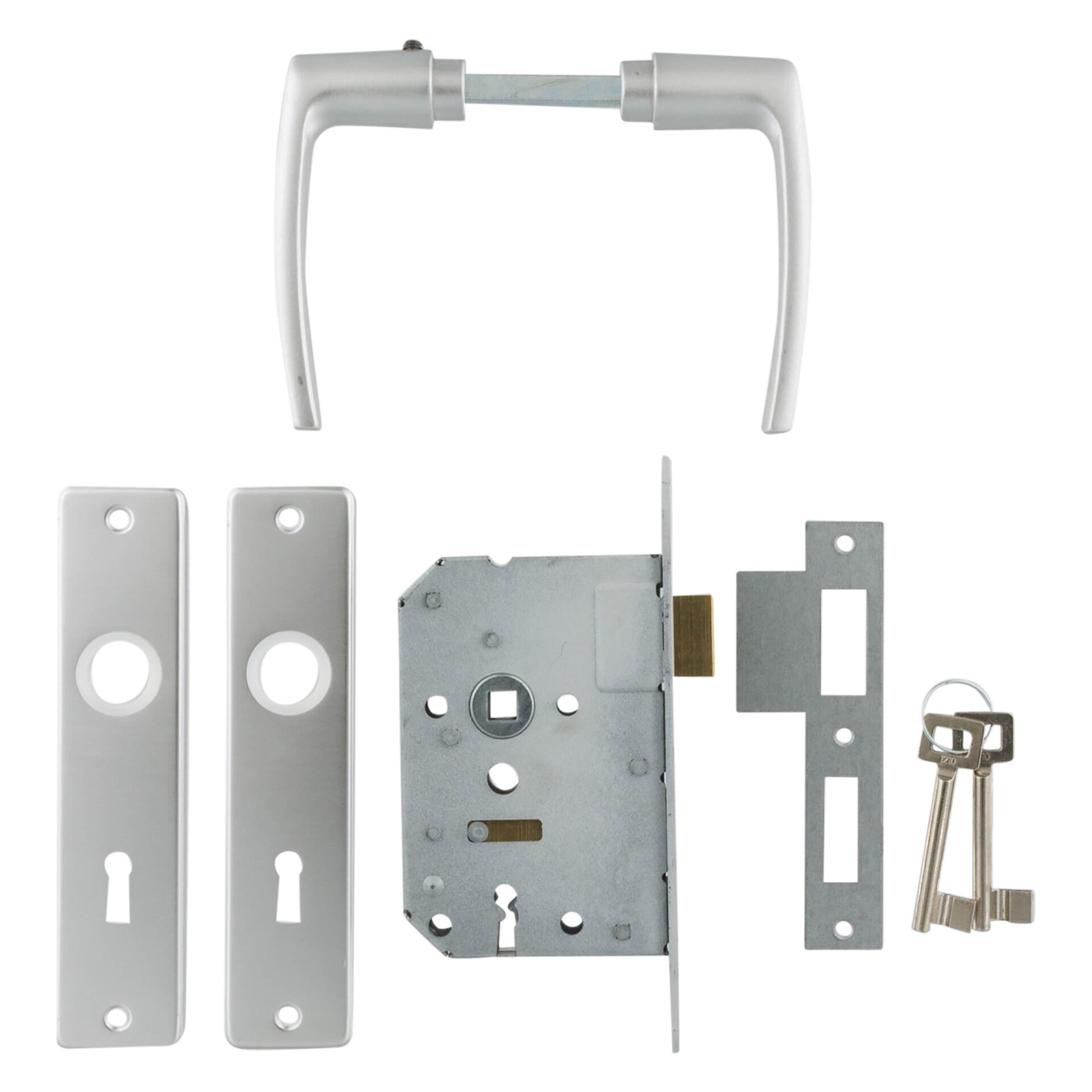 Blisterkaart met slot 1266/4, 1 paar geëloxeerde deurkrukken (blokmodel) met kortschilden, verzinkte sluitplaat, houtschroeven en patentboutjes. Doornmaat 50 mm.