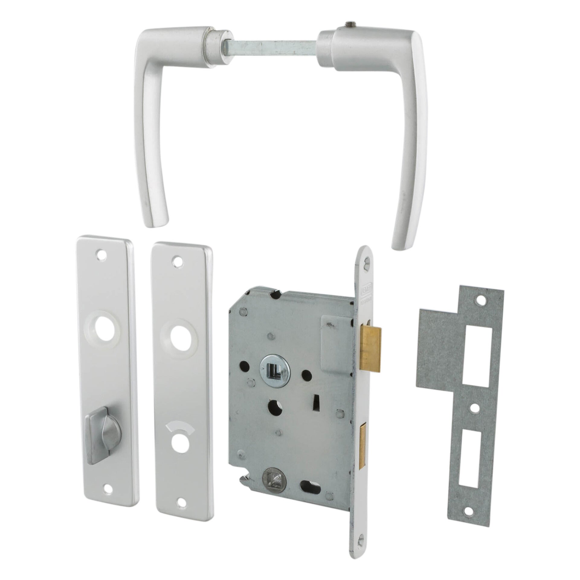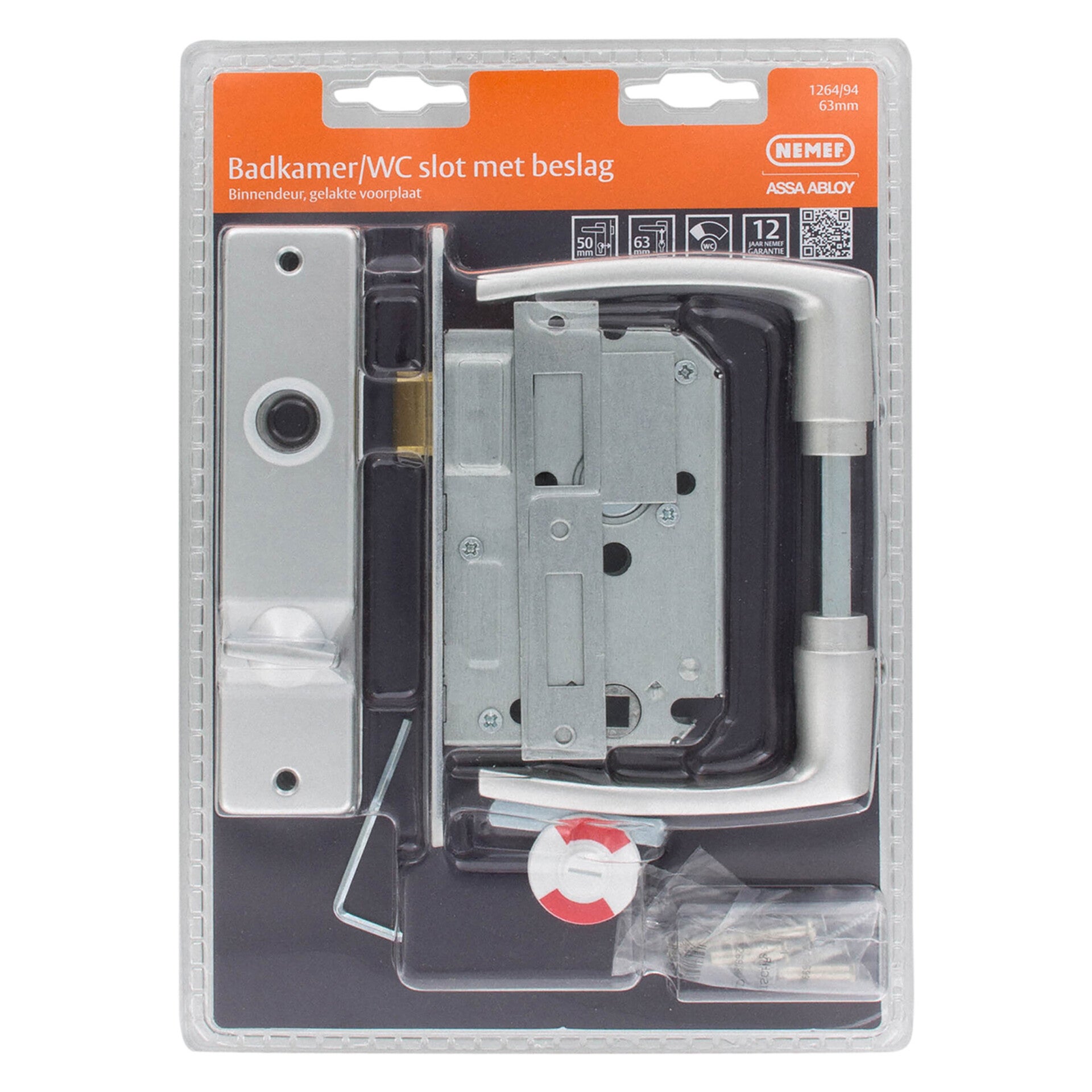 Blisterkaart met slot 1264/4. 1 paar geëloxeerde deurkrukken (blokmodel) met kortschilden 63/8 mm. Verzinkte sluitplaat, houtschroeven en patentboutjes.