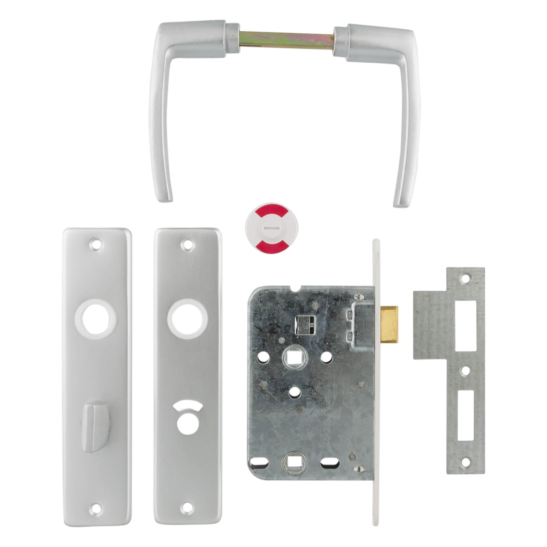1 paar geëloxeerde deurkrukken (blokmodel) met kortschilden 63/8 mm. Verzinkte sluitplaat, houtschroeven en patentboutjes.