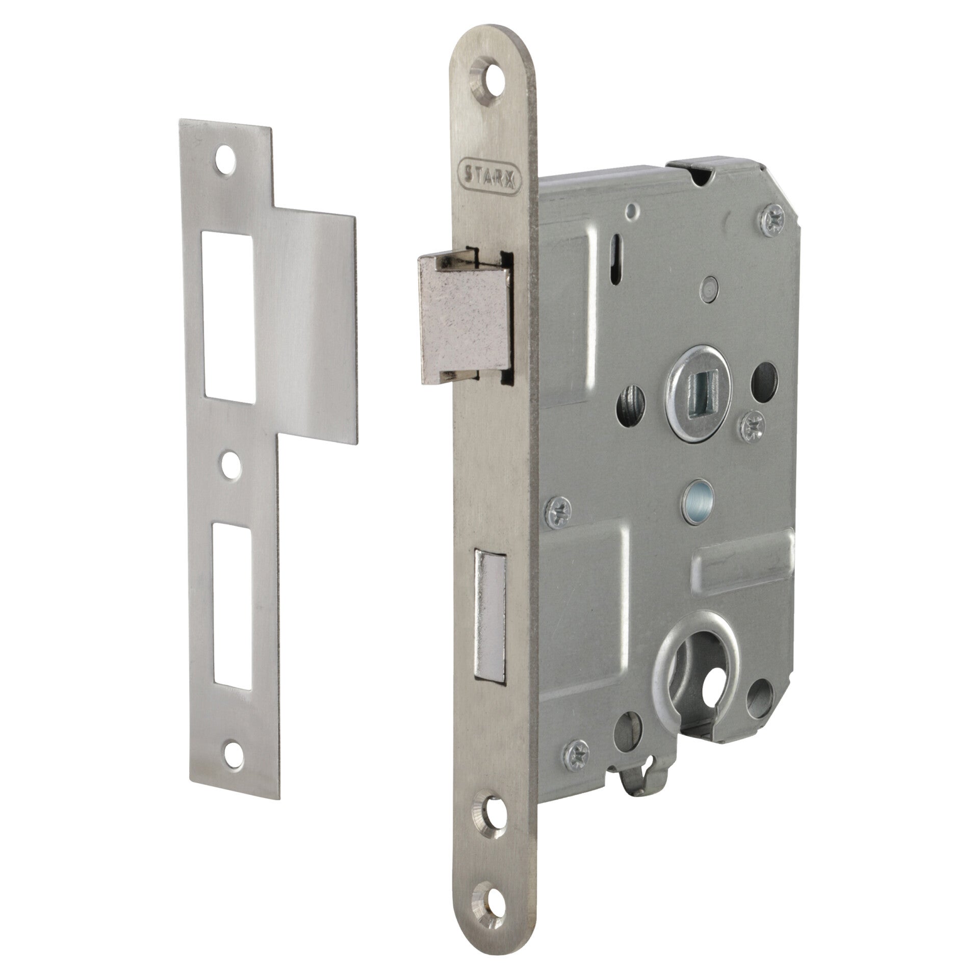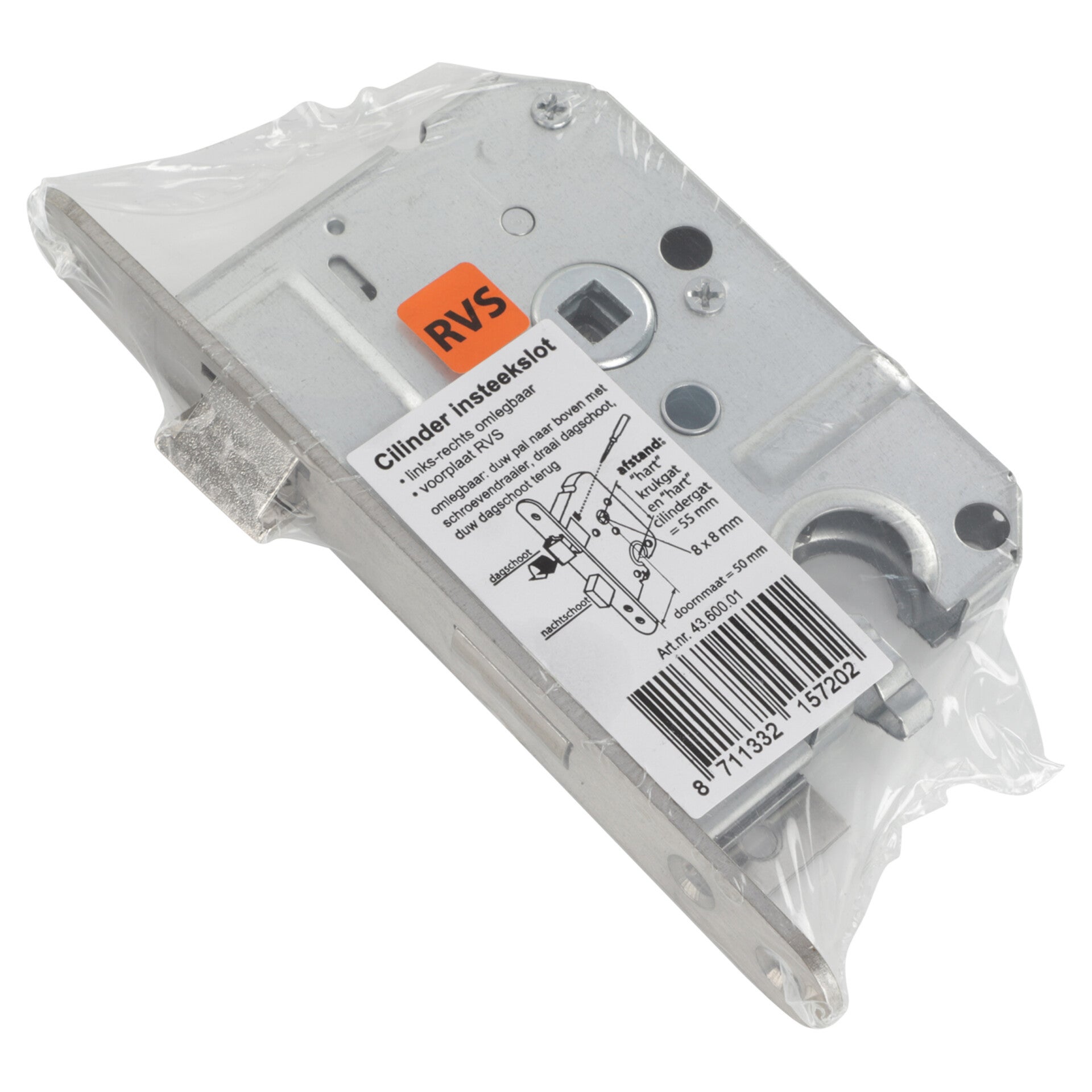 Rechts en links bruikbaar. Sluitplaat: vernikkeld. Dagschoot: messing. Doornmaat: 50 mm. Afstand krukgat/cilindergat: 55 mm.