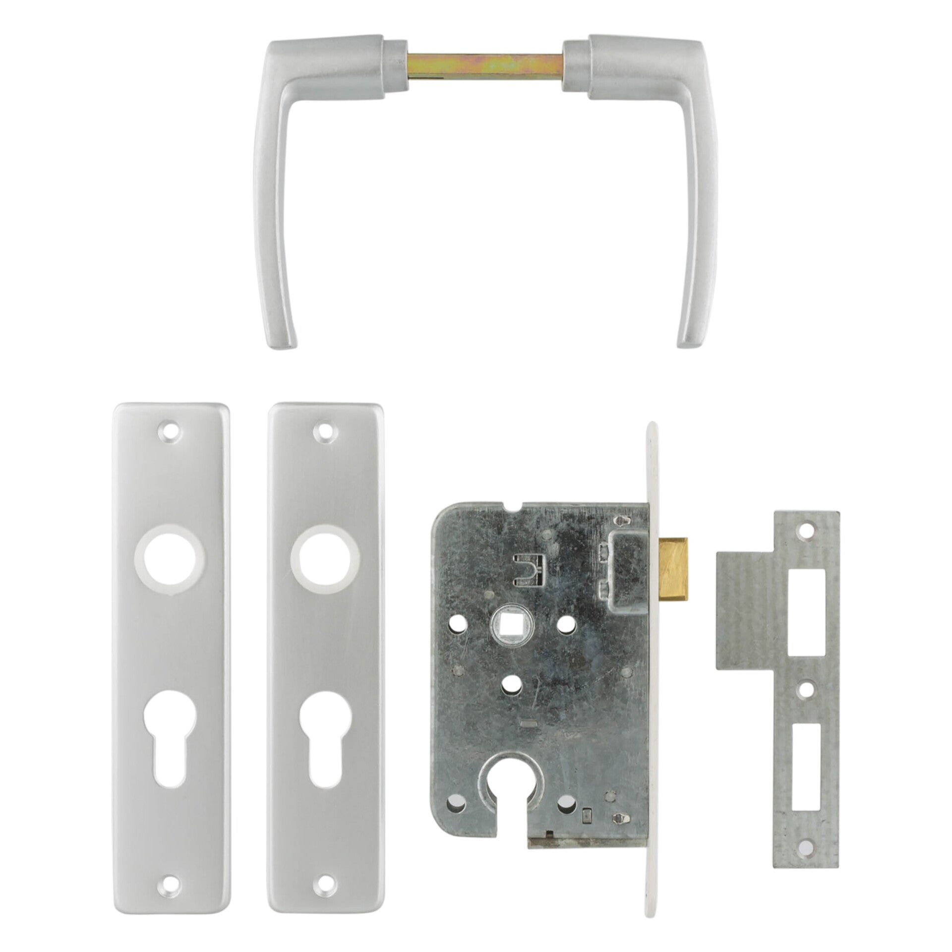 Rechts en links bruikbaar. Sluitplaat: vernikkeld. Dagschoot: messing. Doornmaat: 50 mm. Afstand krukgat/cilindergat: 55 mm.