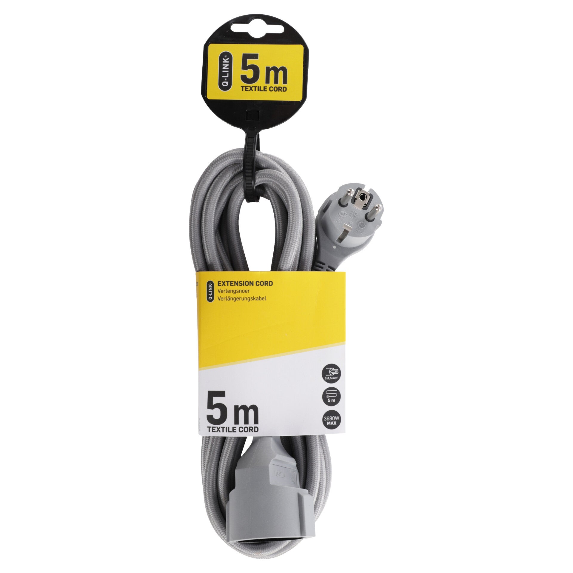 Verlengsnoer in de kleur zilver met ingebouwde randaarde. Platte textielkabel van 5 meter met kabeldikte 3 x 1.5 mm². Maximaal 3680 watt.