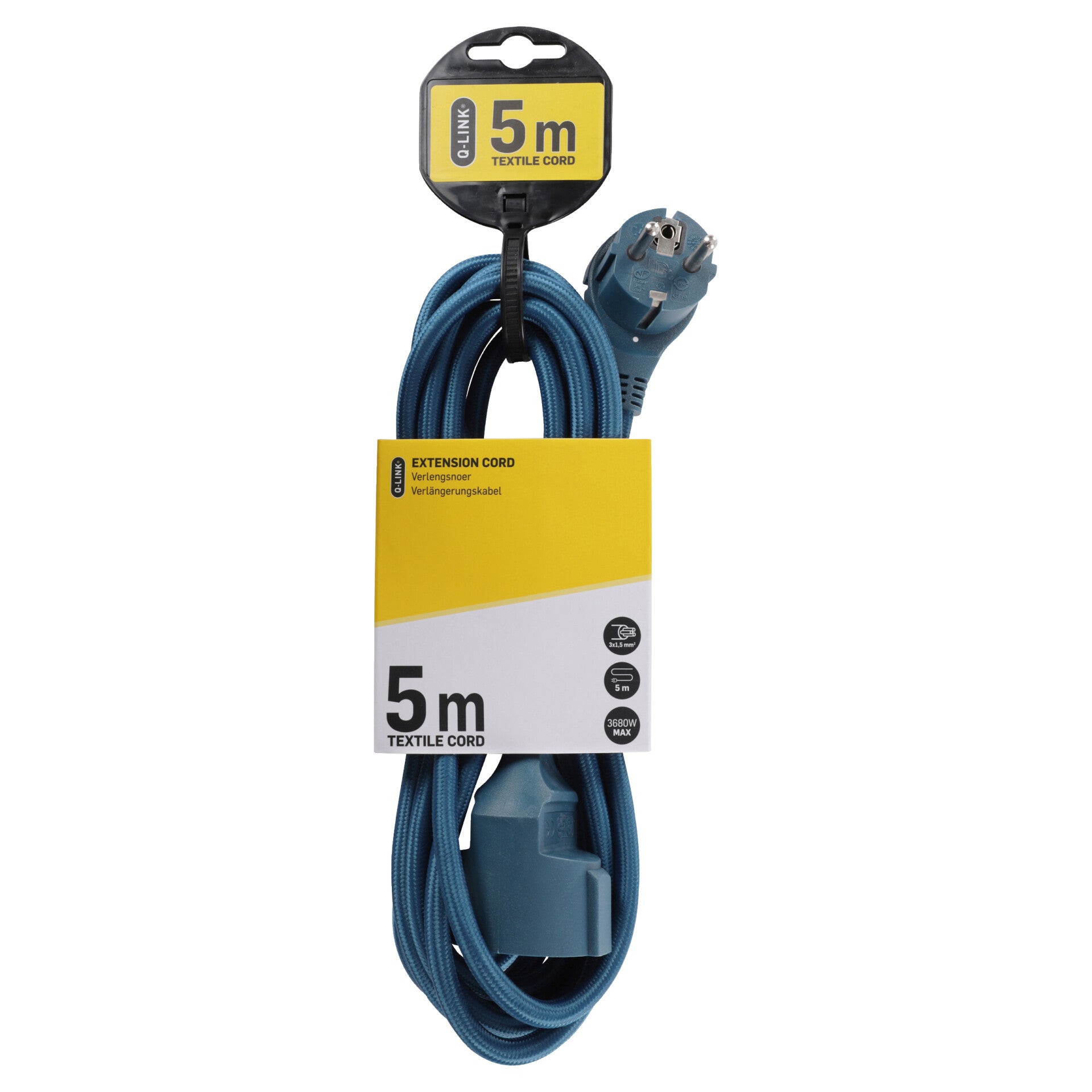 Verlengsnoer in de kleur blauw met ingebouwde randaarde. Platte textielkabel van 5 meter met kabeldikte 3 x 1.5 mm². Maximaal 3680 watt.