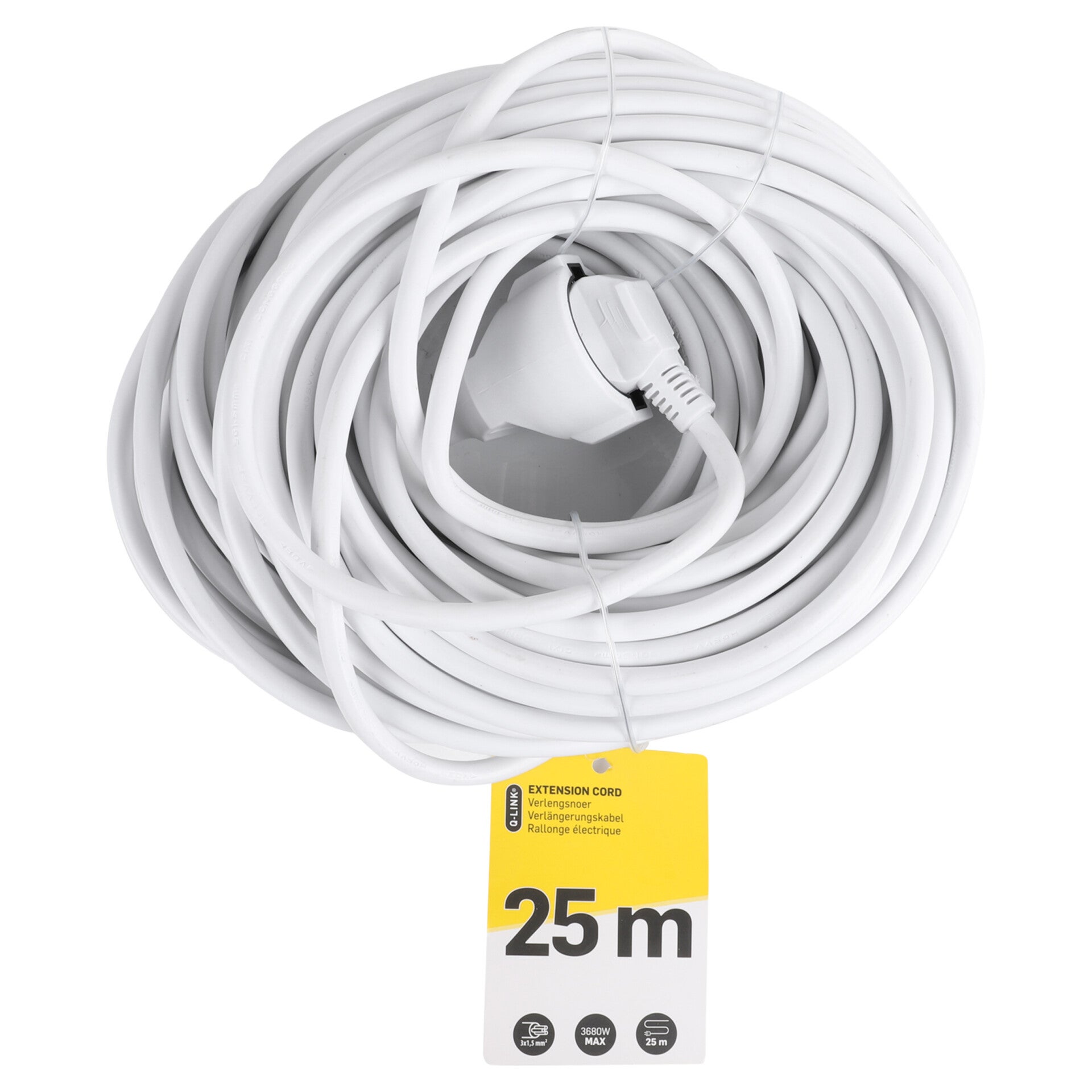 Verlengsnoer in kleur wit met randaarde. Lengte vinylkabel: 3 meter. Kabeldoorsnede van 3 x 1.5 mm². Voor apparaten van maximaal 3680 watt.
