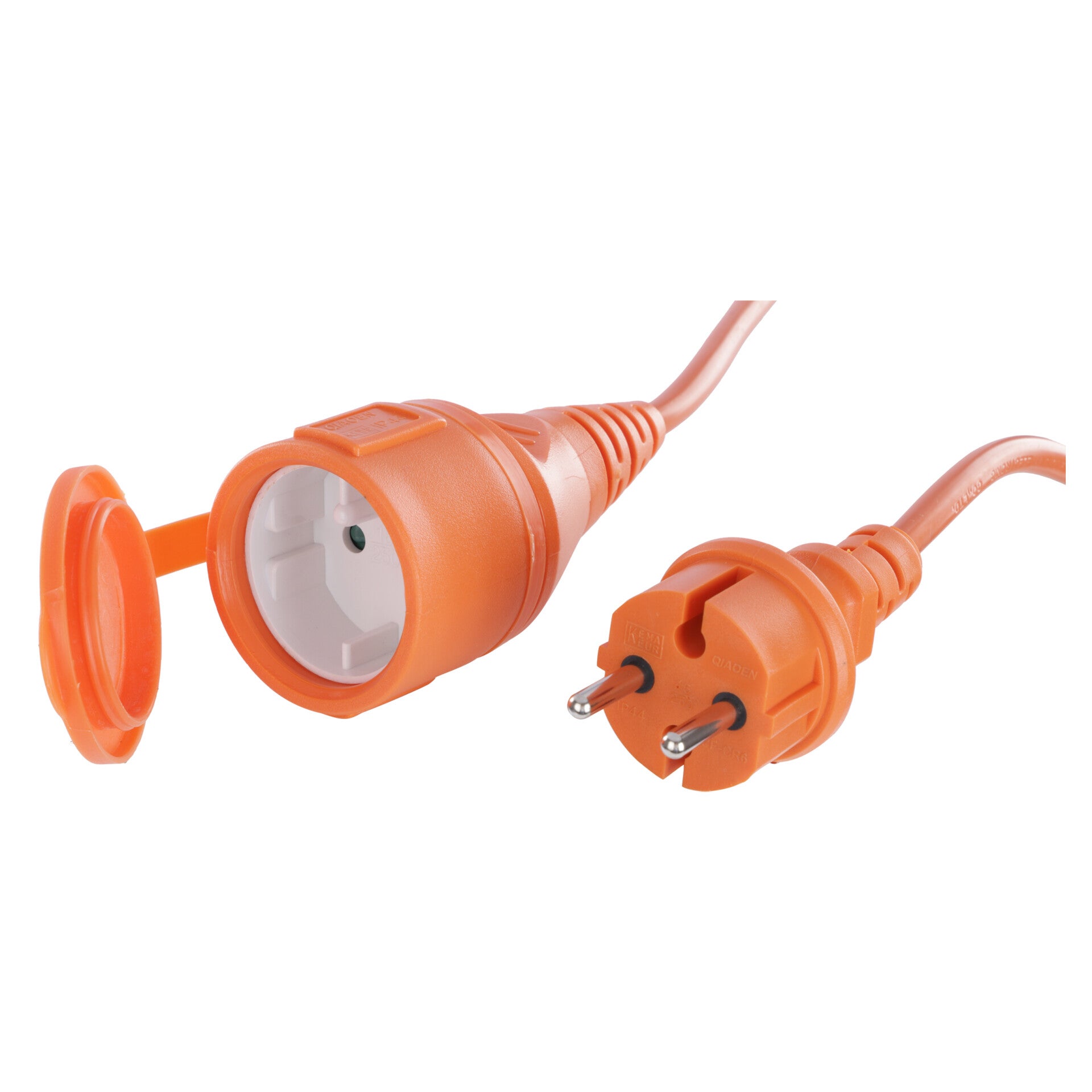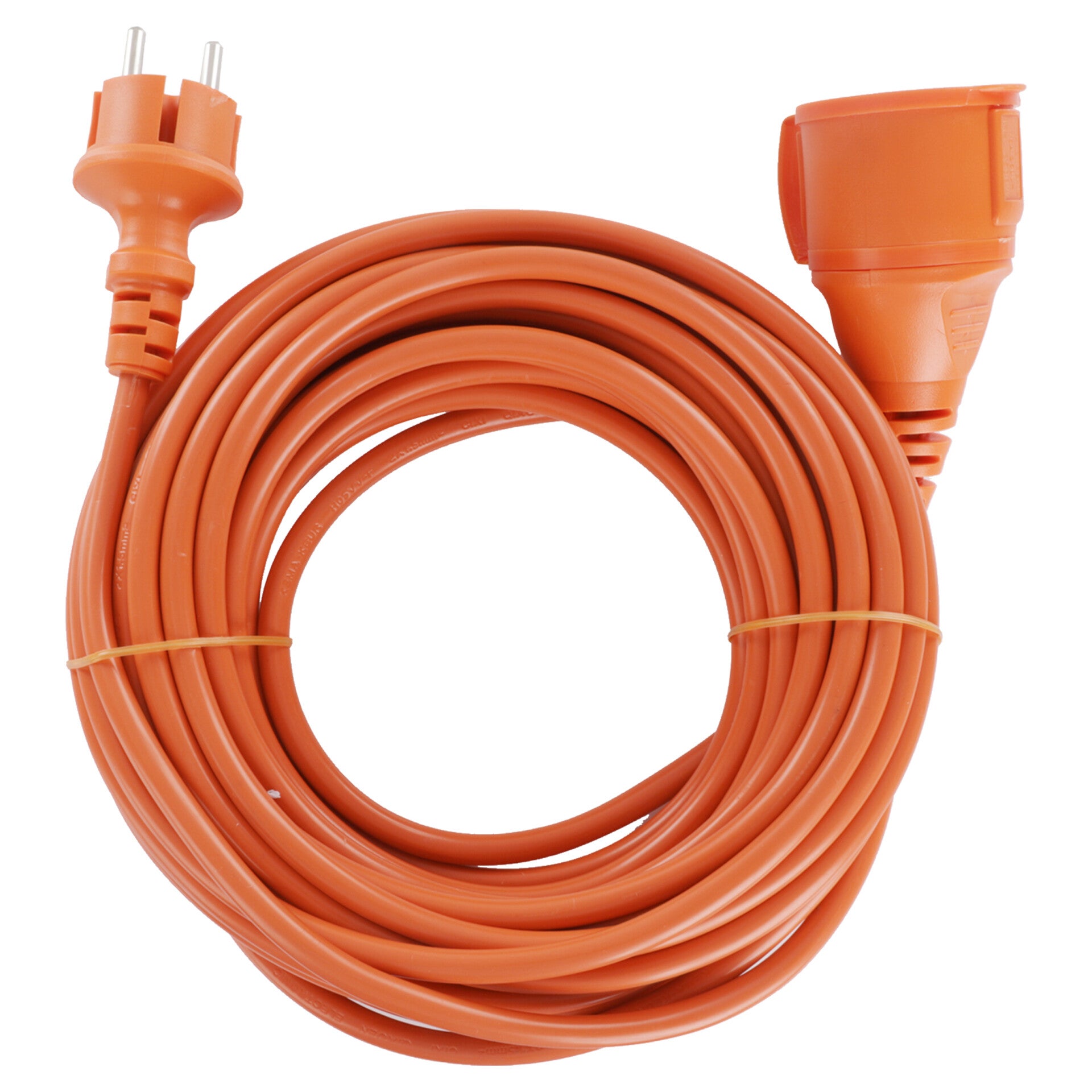 Verlengsnoer in duidelijk oranje voor buitengebruik. Lengte van 12 meter en doorsnede van 2 x 1.5 mm². Spatwaterdicht. Maximaal vermogen van 3500W.