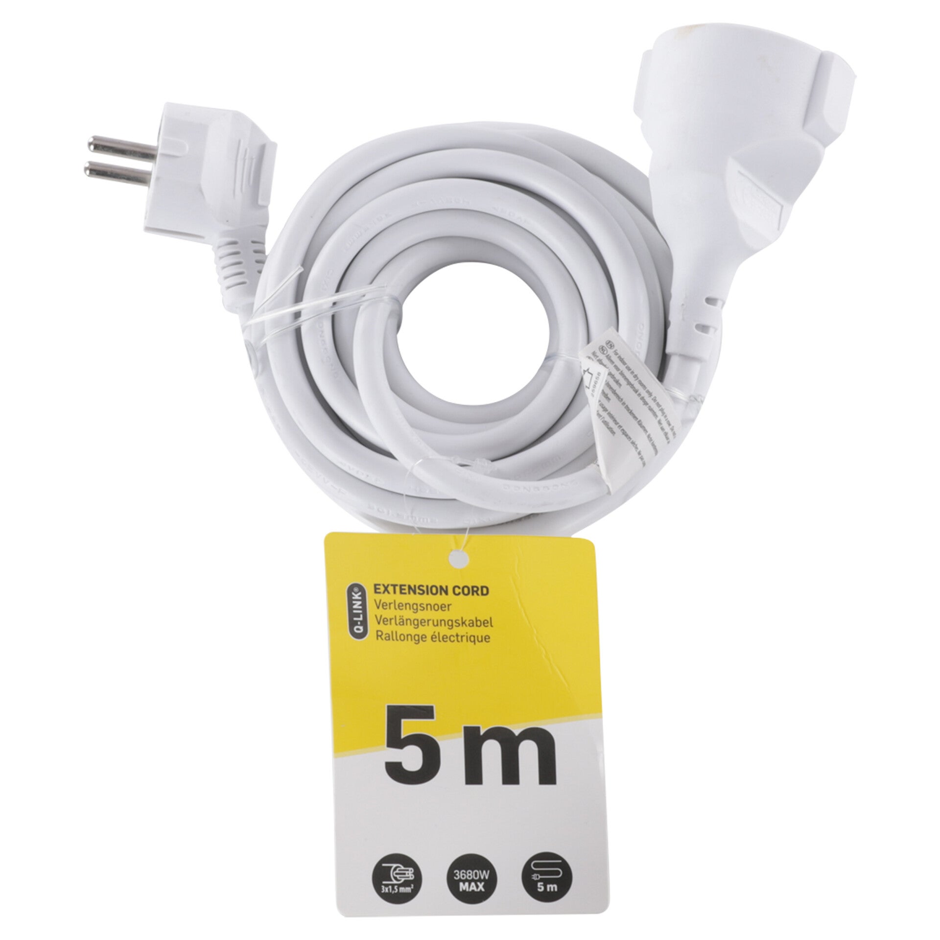 Verlengsnoer met randaarde in de kleur wit. Vinylkabellengte van 5 meter en kabeldoorsnede van 3 x 1.5 mm². Maximaal vermogen van 3680 watt.