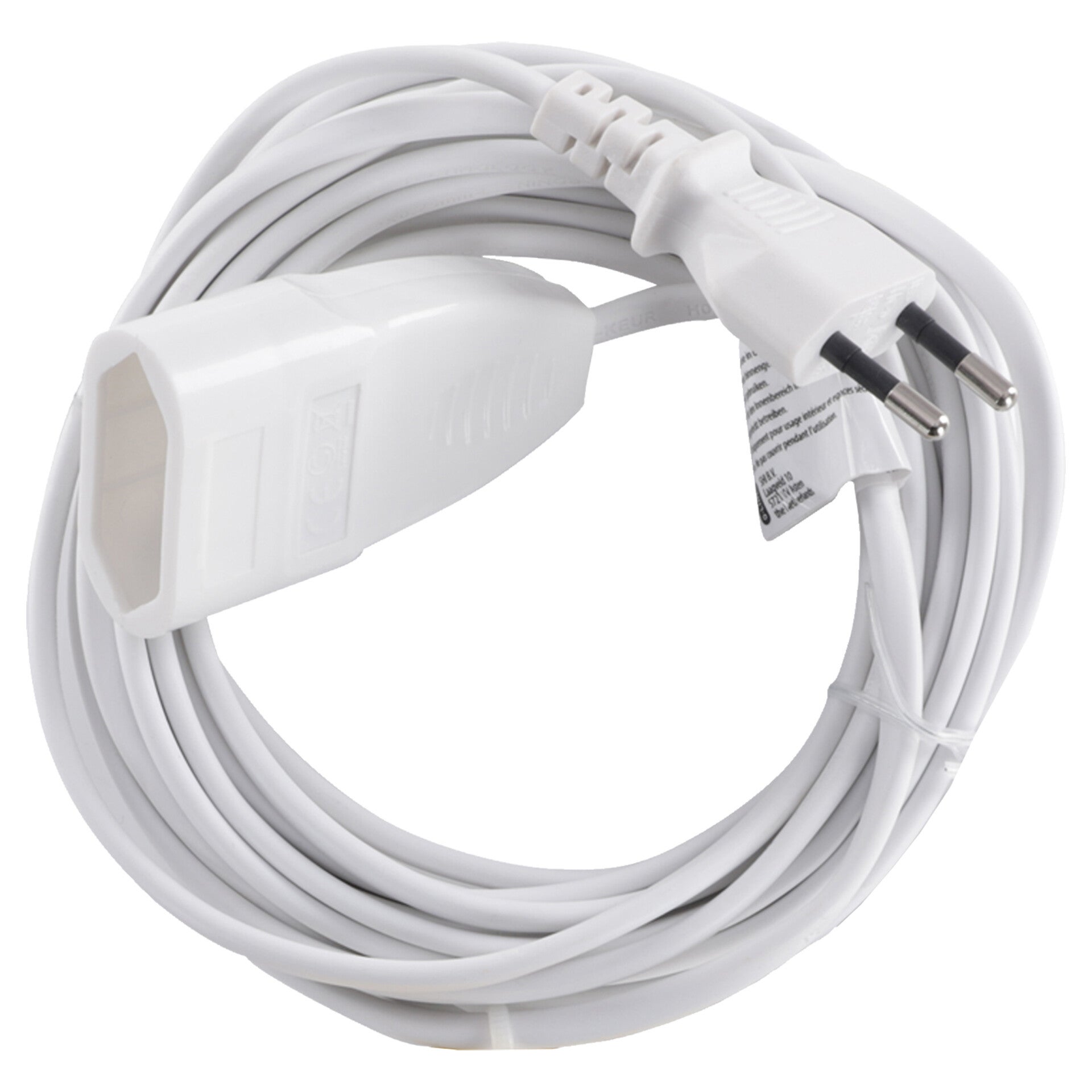 Verlengsnoer in de kleur wit. Alleen voor eurostekkers. Maximaal 575 watt. Alleen voor binnengebruik in droge ruimten. Alleen voor huishoudelijke apparaten. Kabellengte is 5 meter, 2 x 0.75 mm².